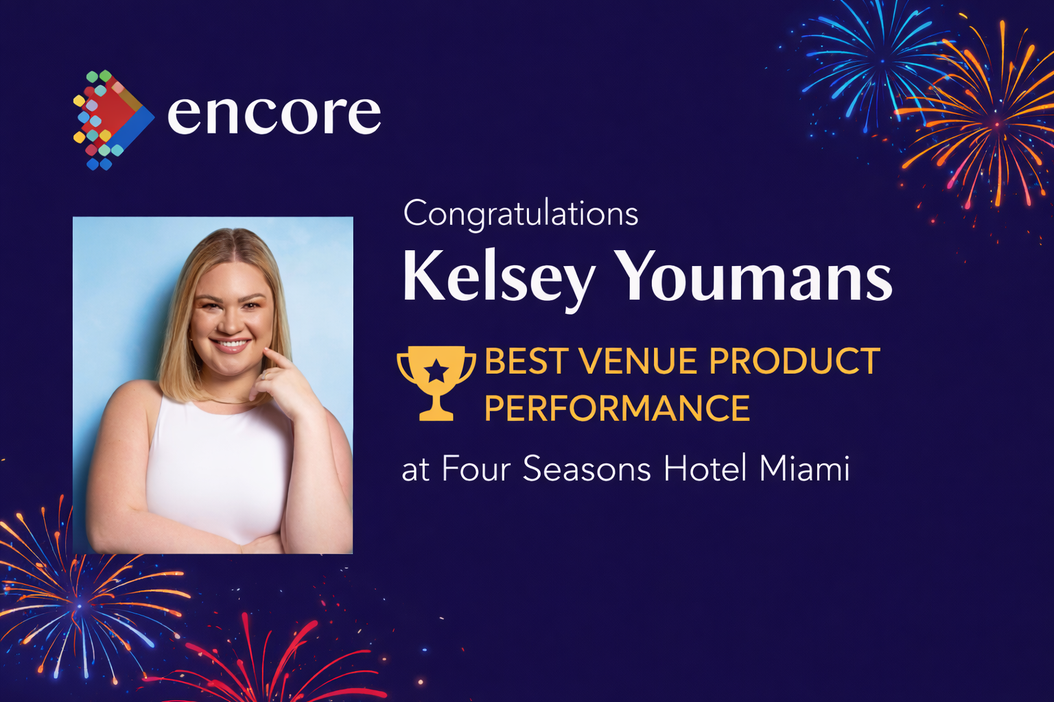 Encore Global invests in cutting-edge event technology, but Sales Managers must drive adoption. In Q4 2025, Kelsey won Best Venue Product Performance for generating the highest targeted production revenue at the Four Seasons Hotel Miami.